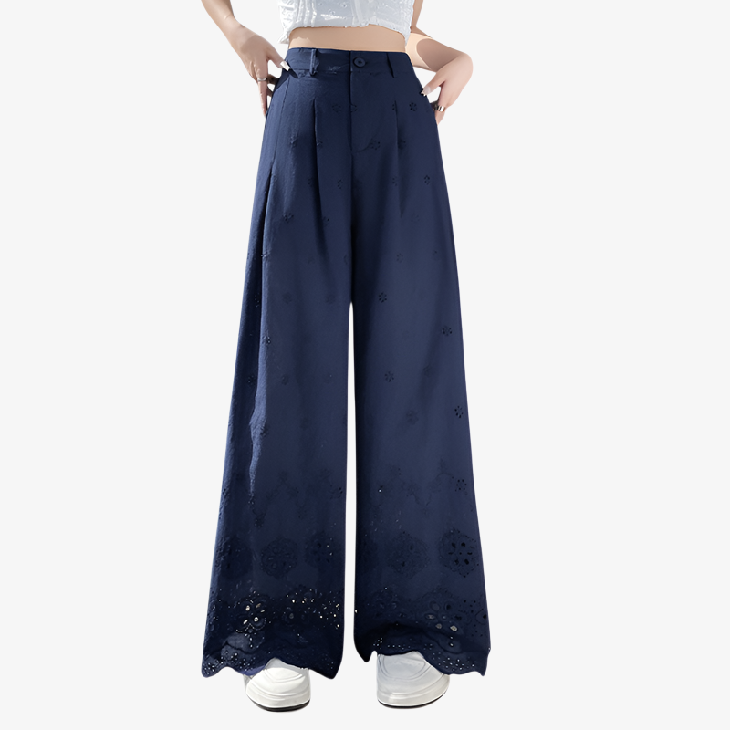 夏用中空ワイドレッグパンツ、フックフラワーワイドレッグパンツ、レディース2025新作、ハイウエストパンツ、スリムドレープレースパンツ、カジュアルストレートパンツ